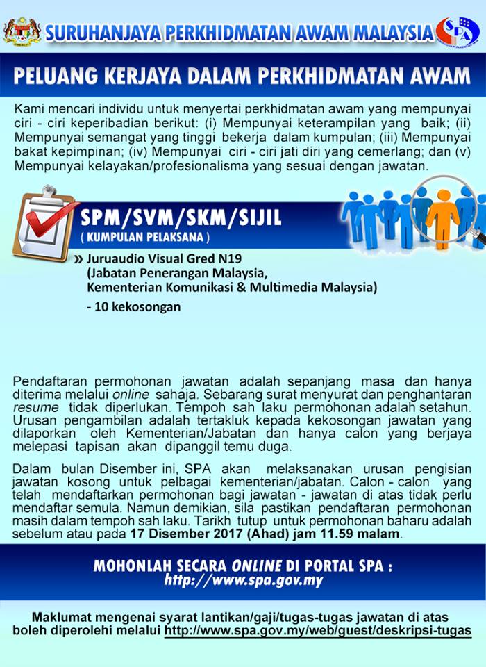 Pihak spa dan jabatan penerangan malaysia akan menjalankan peperiksaan online memasuki perkhidmatan awam psee ujian psikometrik untuk semenanjung malaysia dan sabah bagi jawatan juruaudio visual n19 pada 15 november 2019 ini adalah peluang untuk anda menjawat jawatan di dalam kerajaan jika mengambil tindakan pantas dengan mendaftar dengan spa8 untuk jawatan juruaudio visual n19 ini. Operator wayarles n19 39. Syarat kelayakan juruaudio visual gred n19 warganegara malaysia. Pembantu penyediaan makanan n19 45.
