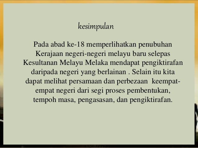 Kesimpulan tentang kesultanan melayu melaka. Kesimpulan secara keseluruhan dapat dijelaskan bahawa zaman kesultanan melayu melaka menjadi titik tolak yang penting dalam lipatan sejarah di malaysia. 3 2 kesultanan melayu melaka asas pembentukan negara dan bangsa kesultanan melayu melaka pada abad ke 15 merupakan asas pembinaan negara dan bangsa kita. Antaranya ialah sulalatus salatin sejarah melayu merupakan satu karya sejarah mengenai kebangkitan kegemilangan dan kejatuhan zaman kesultanan melayu melaka yang ditulis oleh berberapa orang pengarang melayu sejarah melayu ditulis di melaka dan dibawa bersama semasa sultan mahmud syah berundur dari melaka pada tahun 1511 naskhah asal ini kemudian dibawa ke johor dari kampar sumatera pada. Peradaban dan peraturan kenegaraan kerajaan ini tercatat dalam seajrah melayu atau sulalatus salatin karangan tun seri lanang yang merupakan dokumen historiografi melayu terpenting.